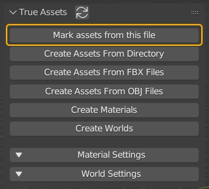 Below is the menu that will appear in the 3d viewport when this option is clicked. This is the "Mark asset and quit" modal and mirrors similar options to the "mark assets from directory" function.