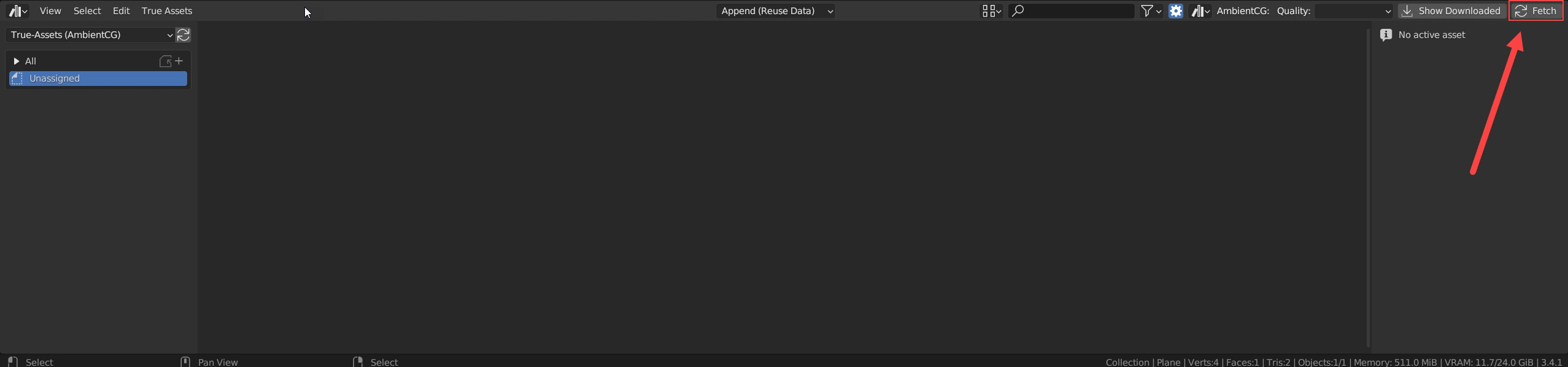 The Online Assets library will appear empty on the first time accessing it. This is because we do not pack any of the materials in the addon, and they will be downloaded directly from online server when you drag-and-drop them into a scene.
