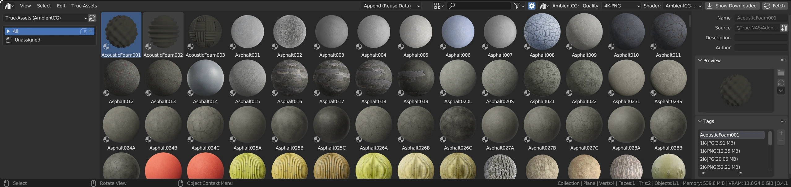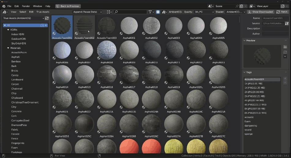 Once the Fetch process has complete. The library will then load in the asset-browser workspace. Please give this a moment, it may be slow depending on internet connection speeds, and then for all the icons to load may take some time depending on your CPU/GPU as we need to now store and load all those icons and material details.